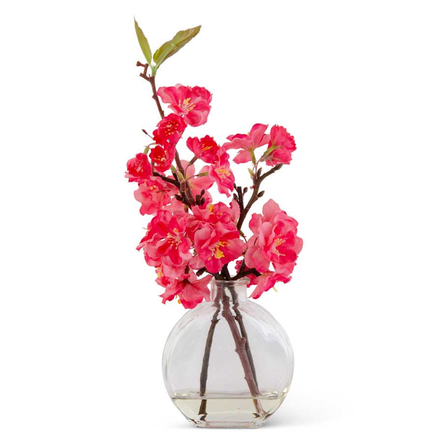 Fuchsia Cherry Blossom in Flat Round Glass Vase