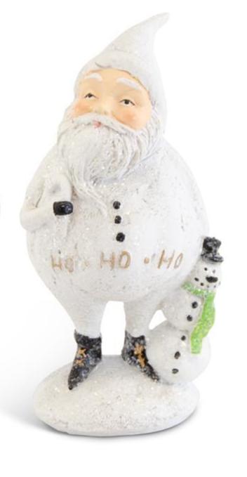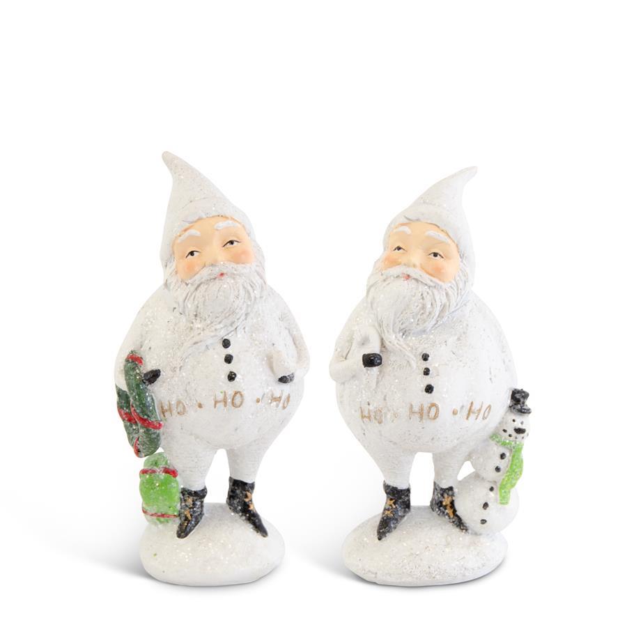 Assorted Glittered White Resin Santas. One Santa is holding a wreath and one Santa is holding a snowman. Sold individually. 55% stone powder 45% resin.