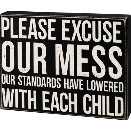 A classic black and white box sign featuring "Please Excuse Our Mess Our Standards Have Lowered With Each Child" sentiment. Easy to hang or can free-stand alone.