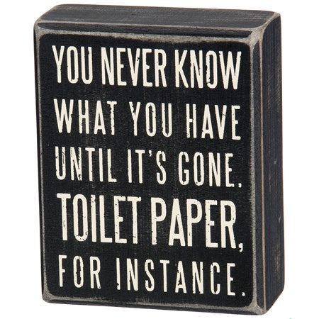 A classic black and white wooden box sign featuring a distressed "You Never Know What You Have Until It's Gone. Toilet Paper, For Instance" sentiment. Easy to hang or can free-stand alone.