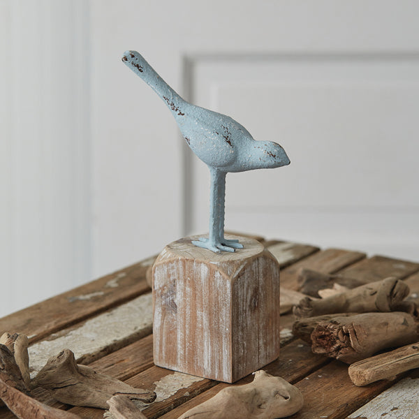Our Cast Iron Blue Bird is a perfect vintage addition to your home decor! Item is made out of cast iron and finished in powder blue with distressing. It sits on a distressed wood base.