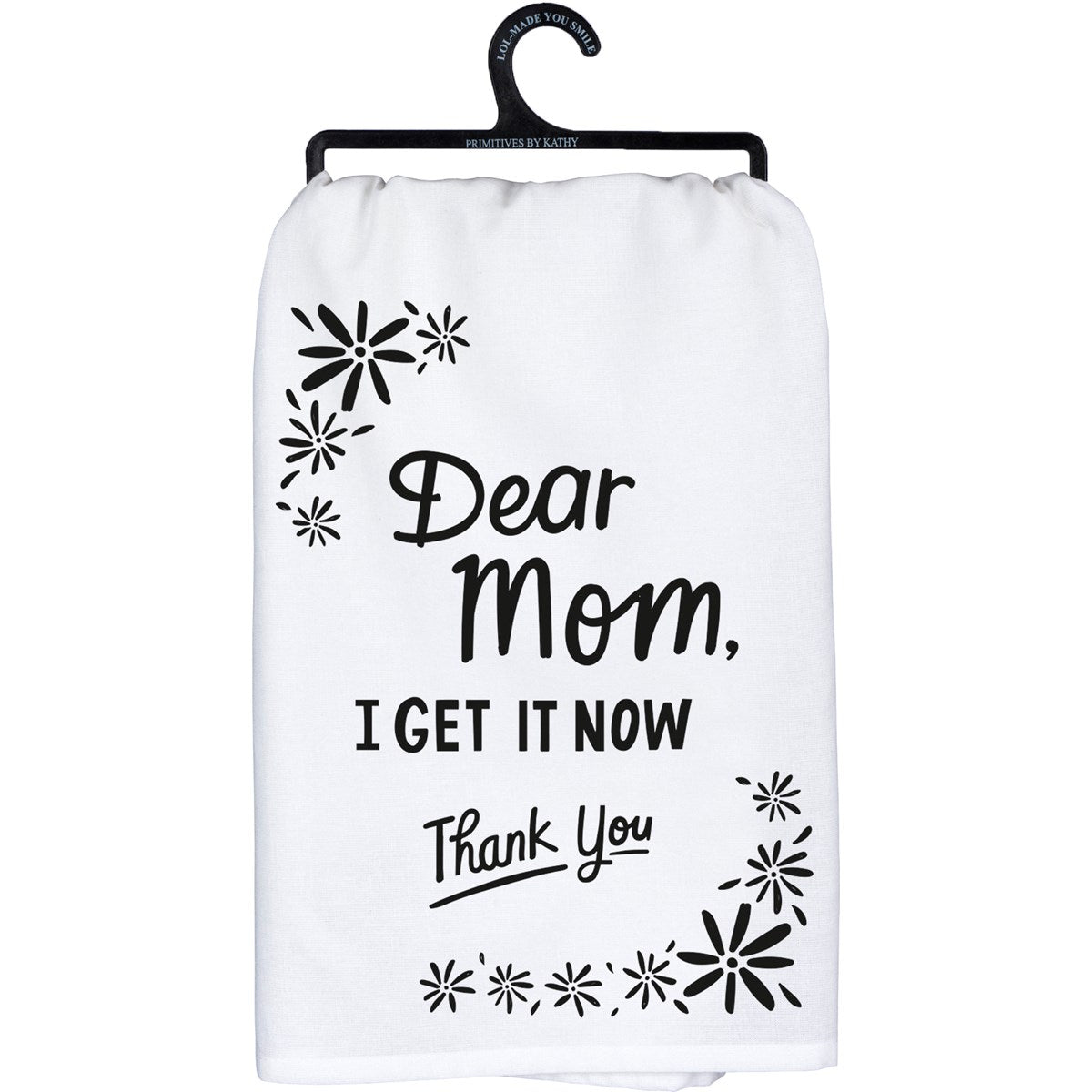 A black and white cotton kitchen towel featuring a "Dear Mom, I Get It Now Thank You" sentiment with floral designs. Machine-washable.