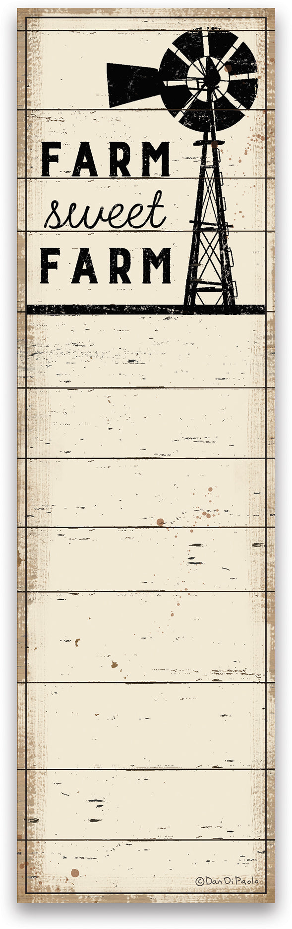 A magnetic paper list notepad lending a distressed "Farm Sweet Farm" sentiment with mill design and slatted wood background print. Includes 60 pages. Made in USA.