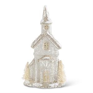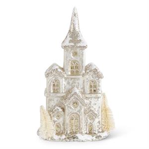 Glittered LED Silver Mercury Glass Houses With Timer. Choice of 3 sizes; sold individually. 3-way switch; middle setting is 6 hours on and 18 hours off. Requires AA batteries (not included).
