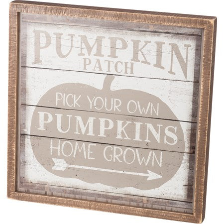 A slat wood inset box sign lending a distressed "Pumpkin Patch - Pick Your Own Pumpkins Home Grown" sentiment. Easy to hang or can free-stand alone.