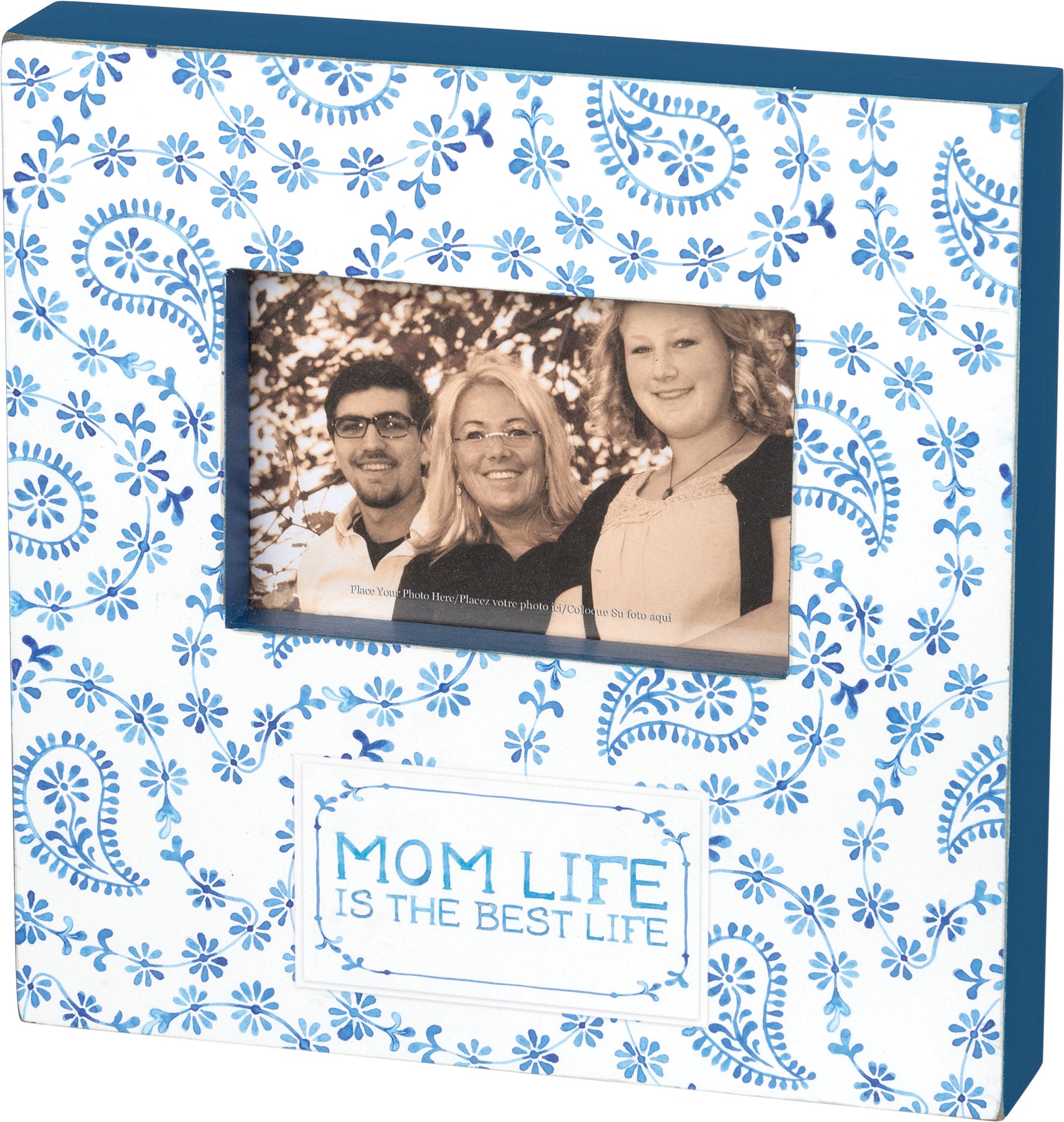 A watercolor art-inspired, blue and white wooden box sign frame lending a "Mom Life Is The Best Life" sentiment with floral paisley print designs. Easy to hang or can free-stand alone. Complements well with coordinating design pieces.