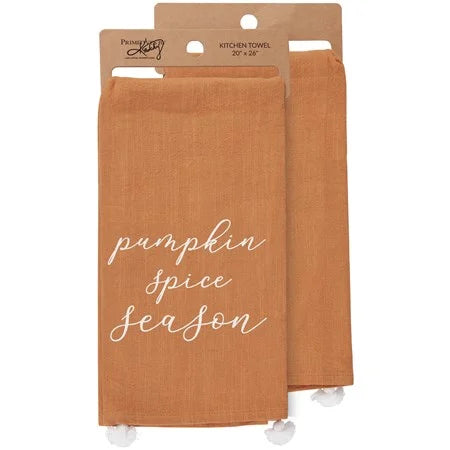 An autumn orange cotton kitchen towel displaying a fall inspired sentiment in a hand illustrated style that reads "Pumpkin Spice Season." Design also features white tassels on edge. Pumpkin Spice kitchen towel is conveniently machine-washable for easy cleaning. A rustic fall-themed kitchen accessory perfect for seasonal use.