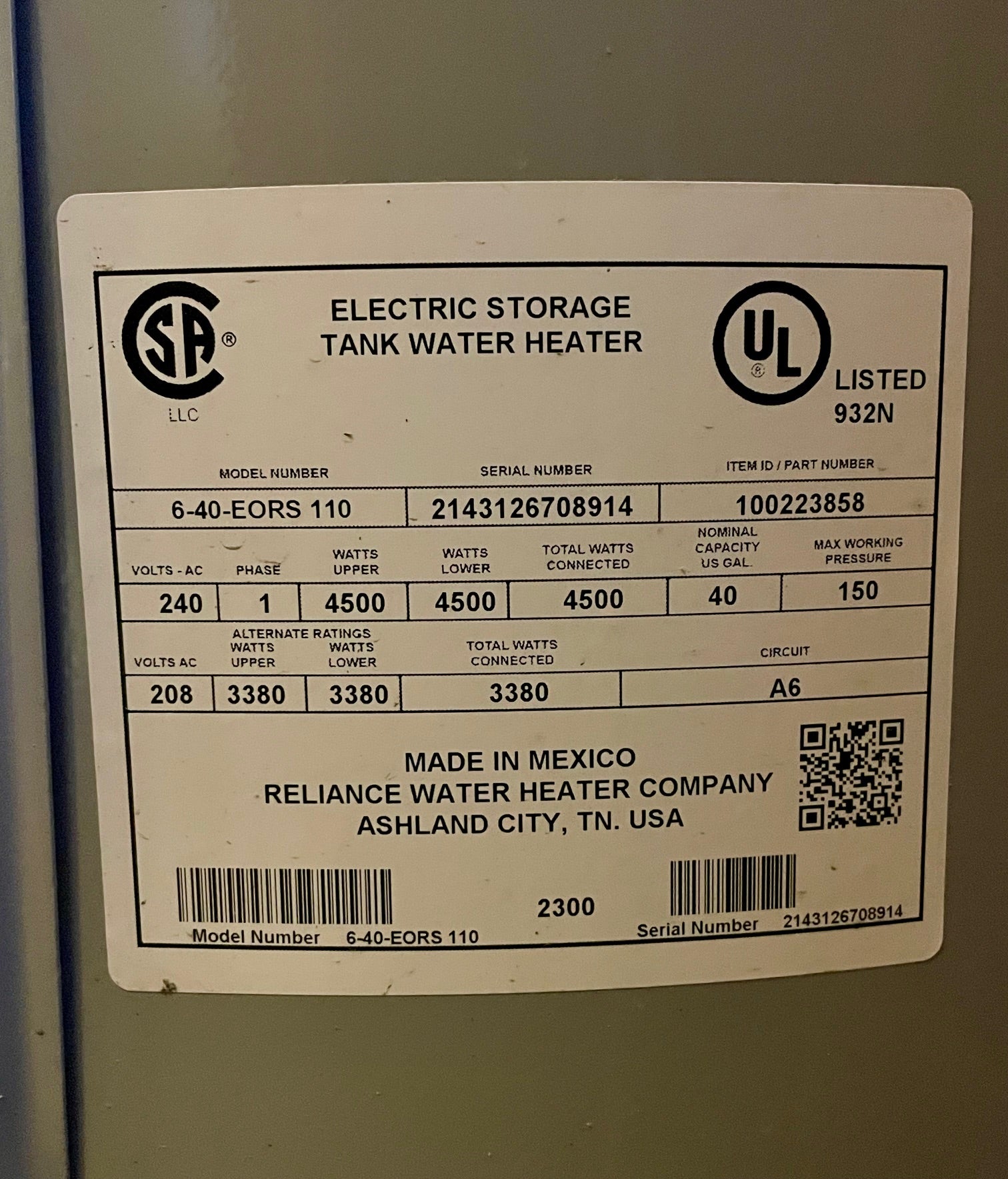 Reliance 40 Gal. Electric Hot Water Heater (Store Pick Up Only)