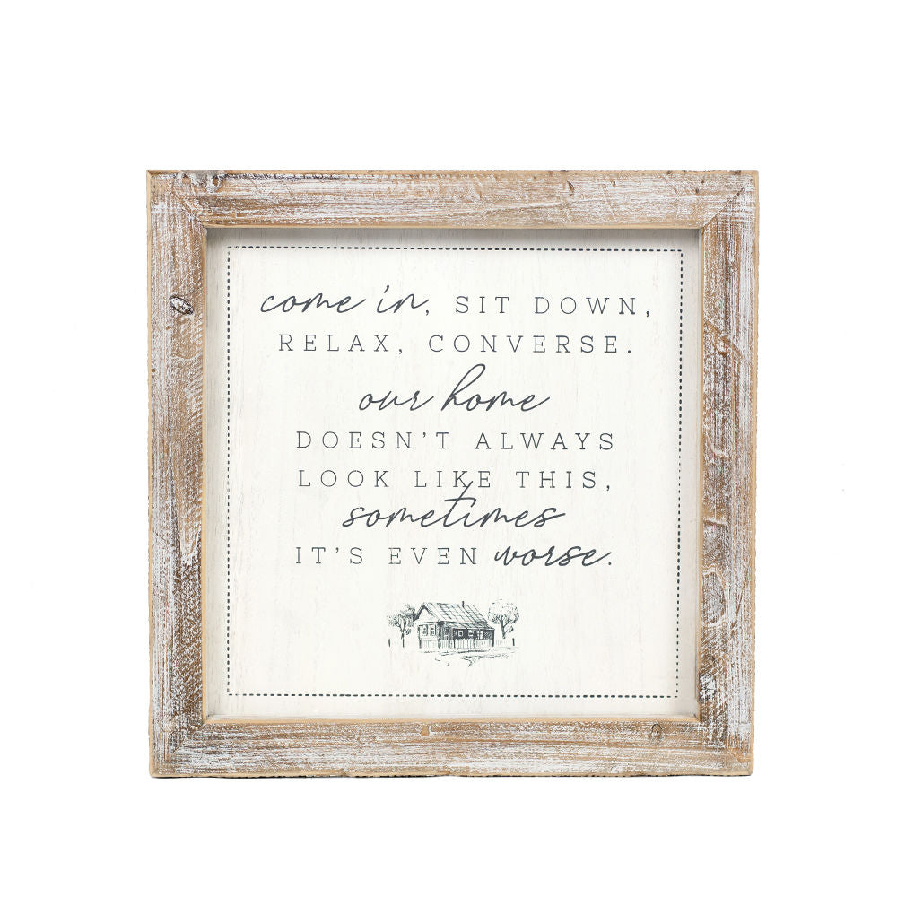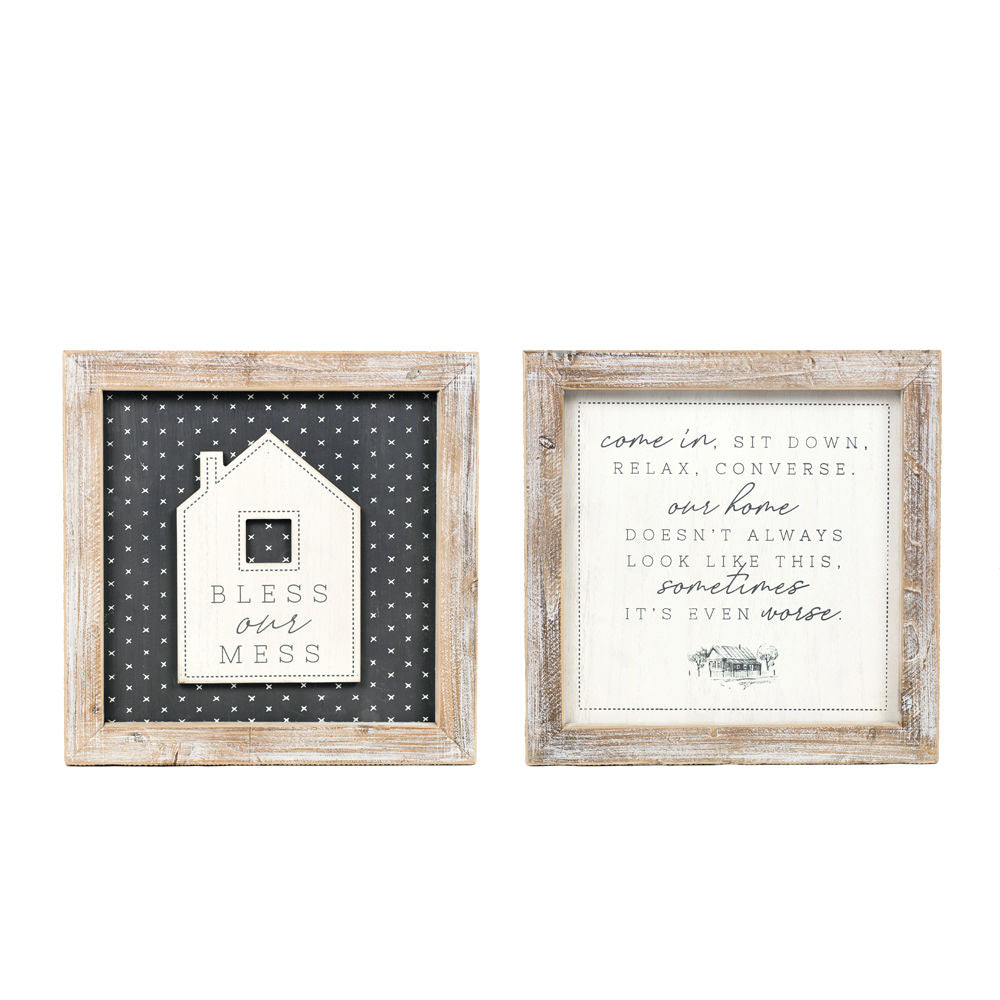 This reversible framed sign is adorned in cozy and rustic white and grey combinations. One side bears the quote "Bless Our Mess" while the other wrote "Come in, sit down, relax, converse. Our home doesn't always look like this. Sometimes, it's even worse."