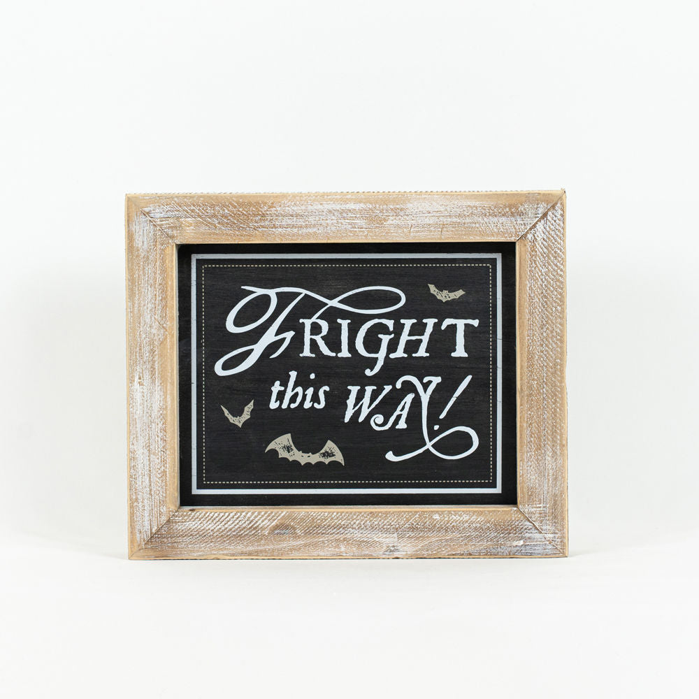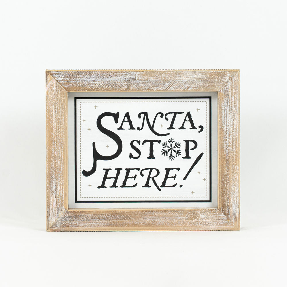 Reversible block sign. One side printed with "Santa, Stop Here!" and other side "Fright this Way!"