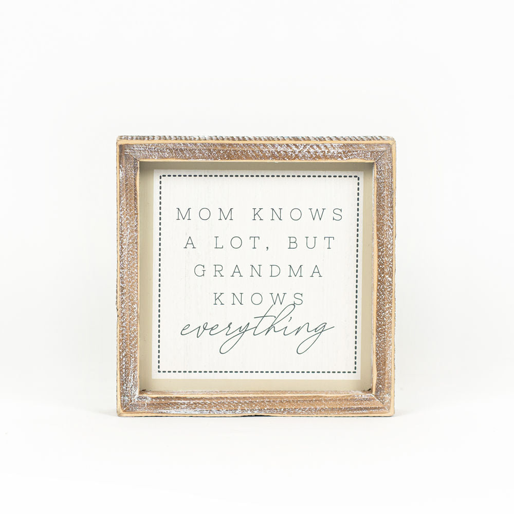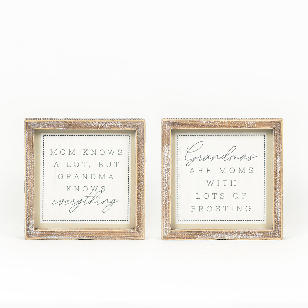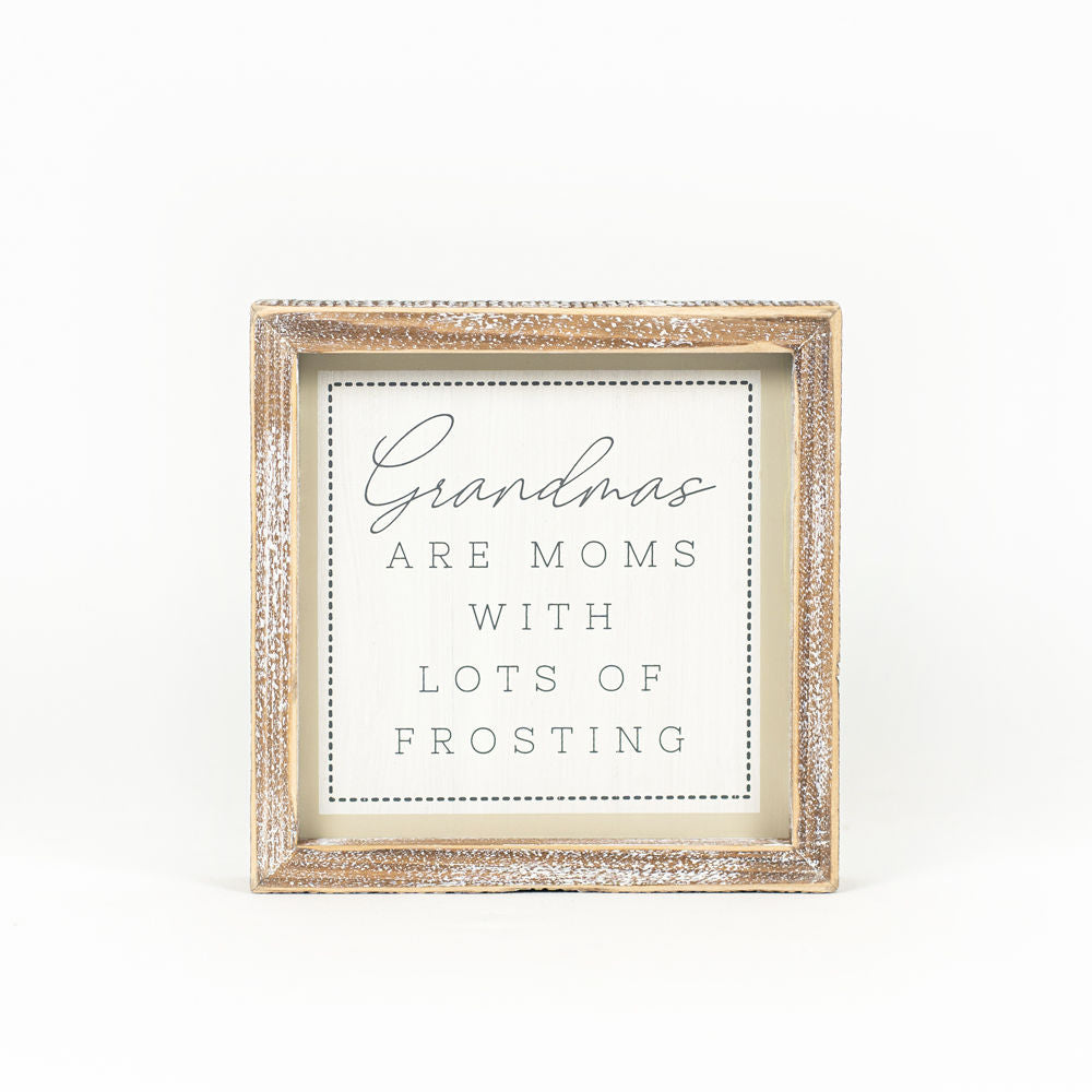 This wooden framed reversible sign has "Mom Knows A Lot, But Grandma Knows Everything" on one side and "Grandmas Are Moms With Lots Of Frosting" on the other side.