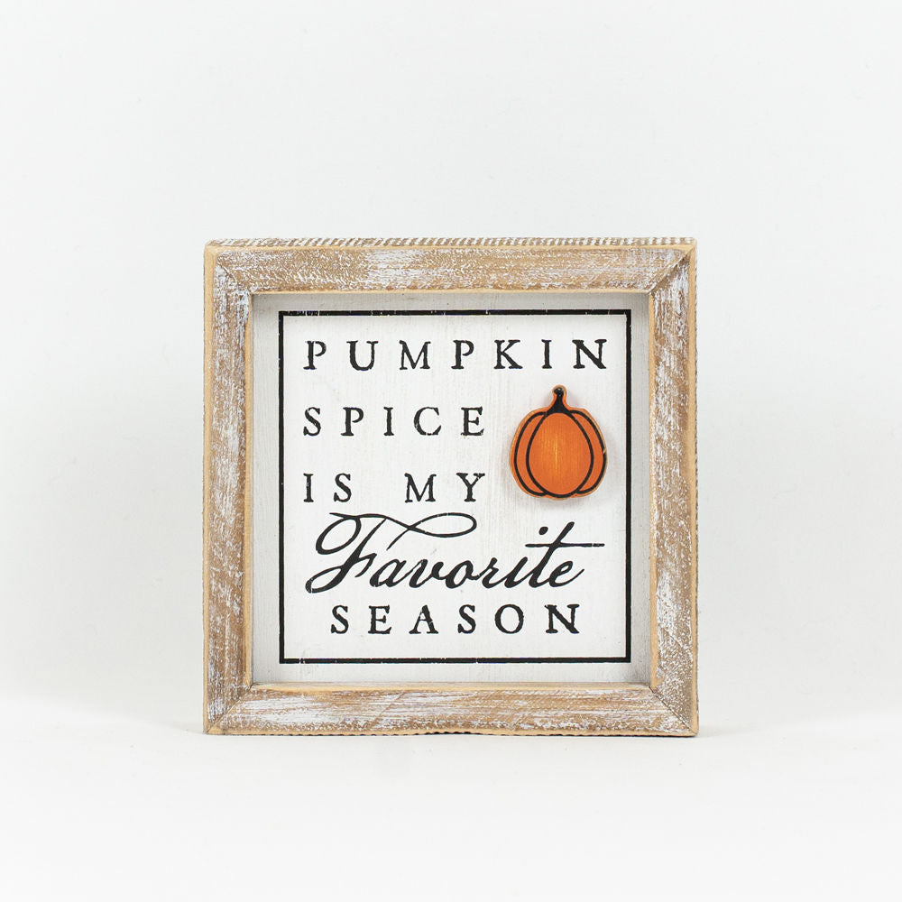 Reversible block sign. One side printed with "If you've got it, haunt it" and reverse side printed with "Pumpkin spice is my favorite season"