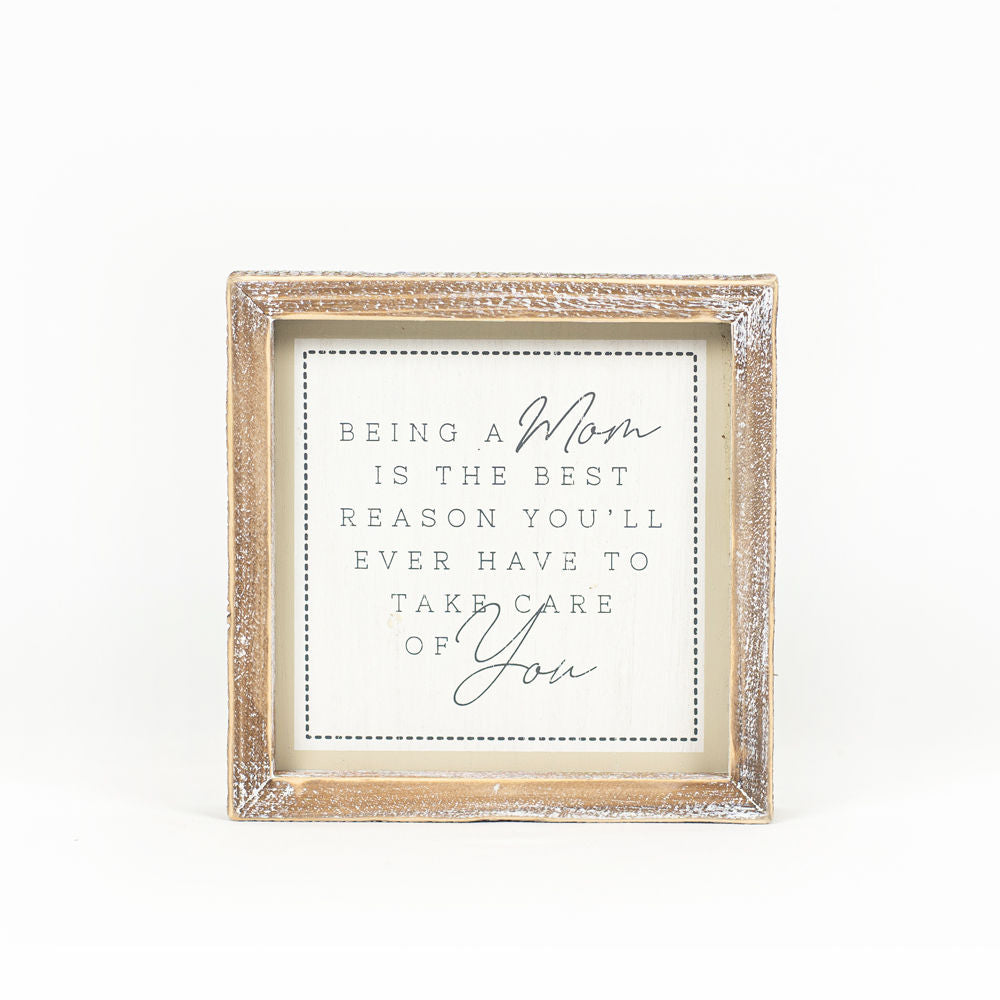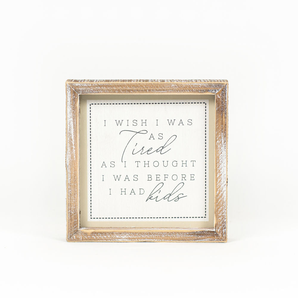 This reversible wooden framed sign says "I Wish I Was As Tired As I Thought I Was Before I Had Kids" on one side and "Being A Mom Is The Best Reasons You'll Ever Have To Take Care of You" on the other side.