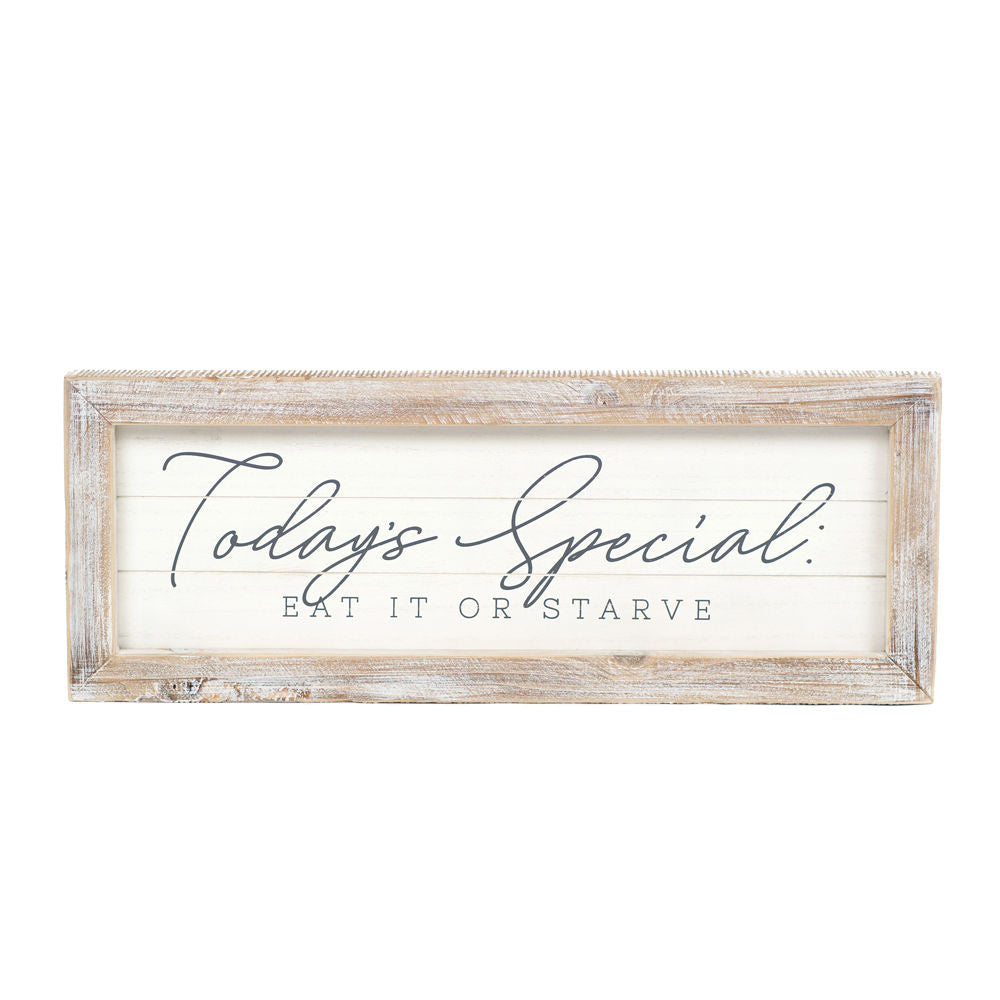 This reversible wood framed sign is adorned in cozy and rustic white, grey, and tan shades. One side bears the quote "Rise & Shine. It's Coffee Time." while the other side shows "Today's Special. Eat It or Starve."