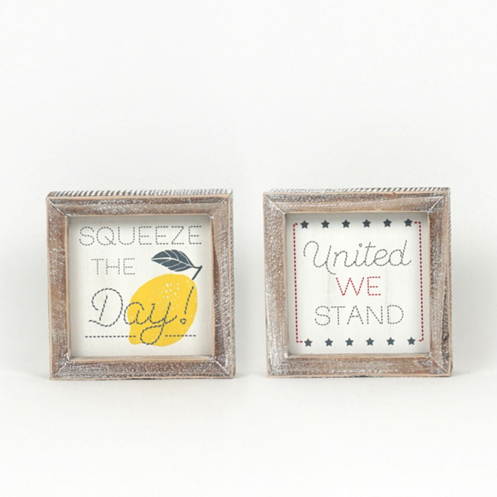 A star-spangled kind of day? Grab this reversible wood-framed sign to celebrate independence day. It comes in a multicolor combination and displays a message, "SQUEEZE THE day!", on one side, and "United WE STAND" on the other side.