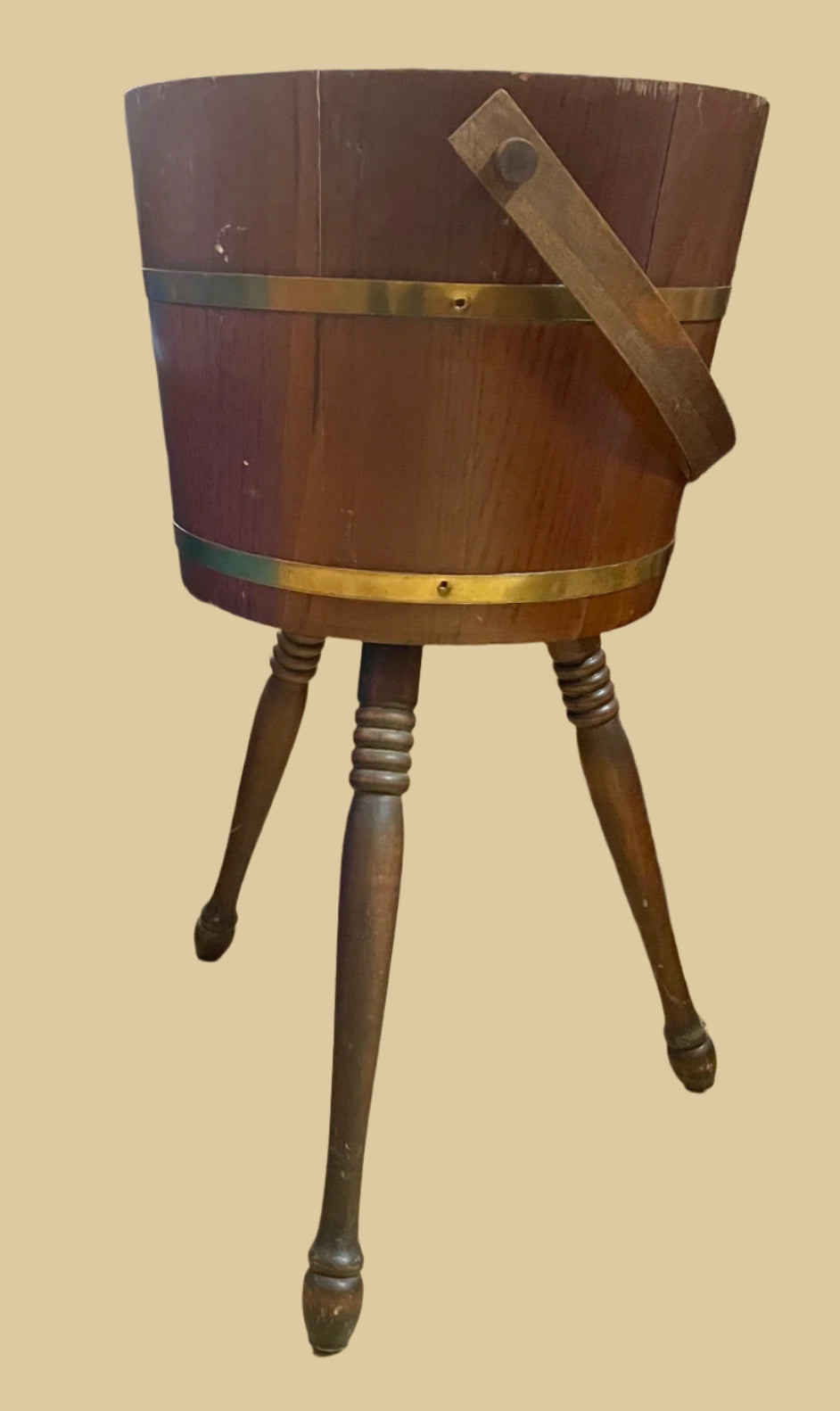 Vintage barrel style sewing bucket or plant stand with spindle legs.
