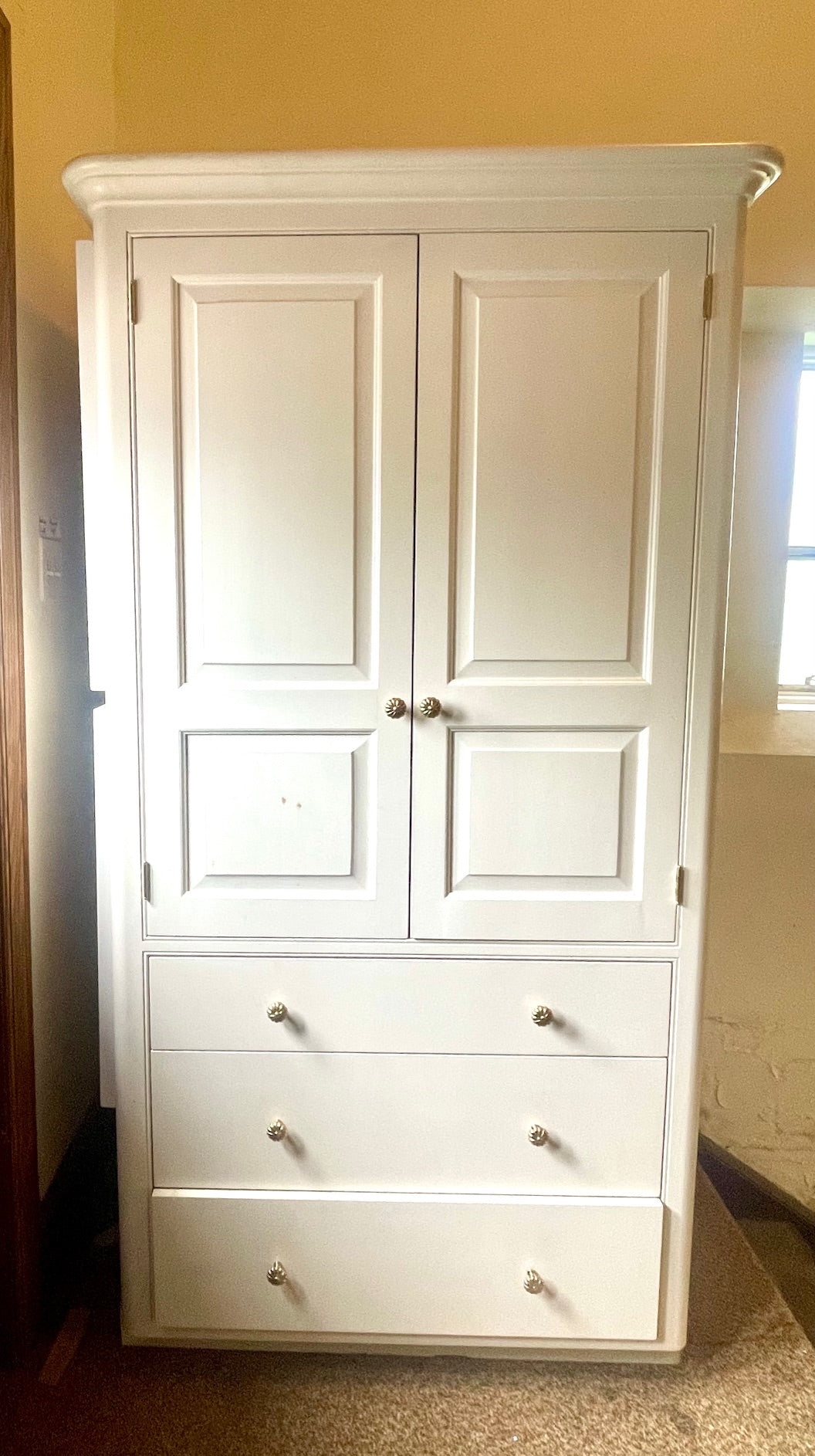White, solid wood armoire with cedar wood inside. Includes two shelves, three drawers, and an outlet hookup. This is a beautiful piece, and is in great condition.