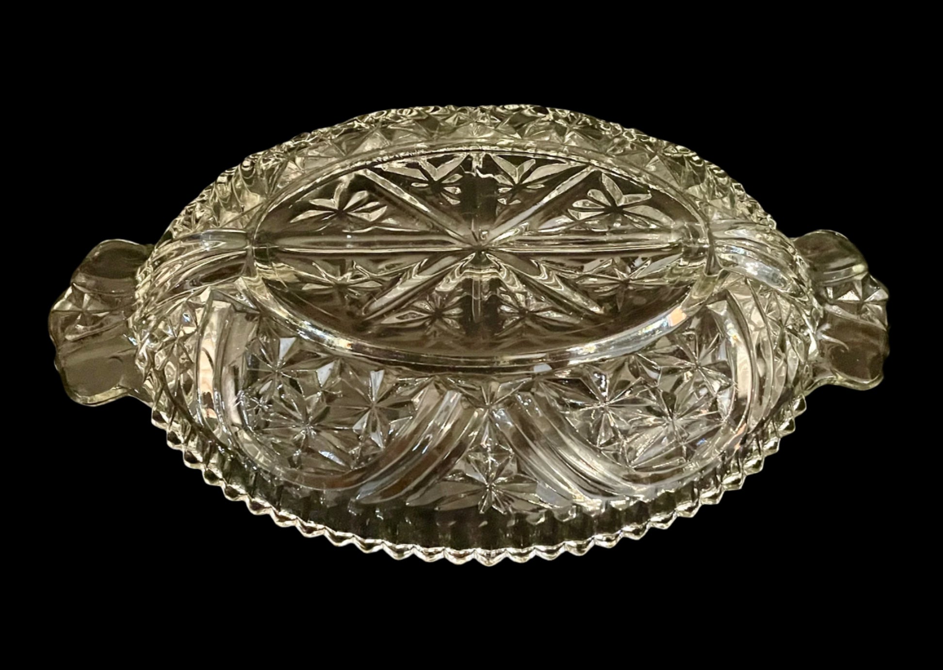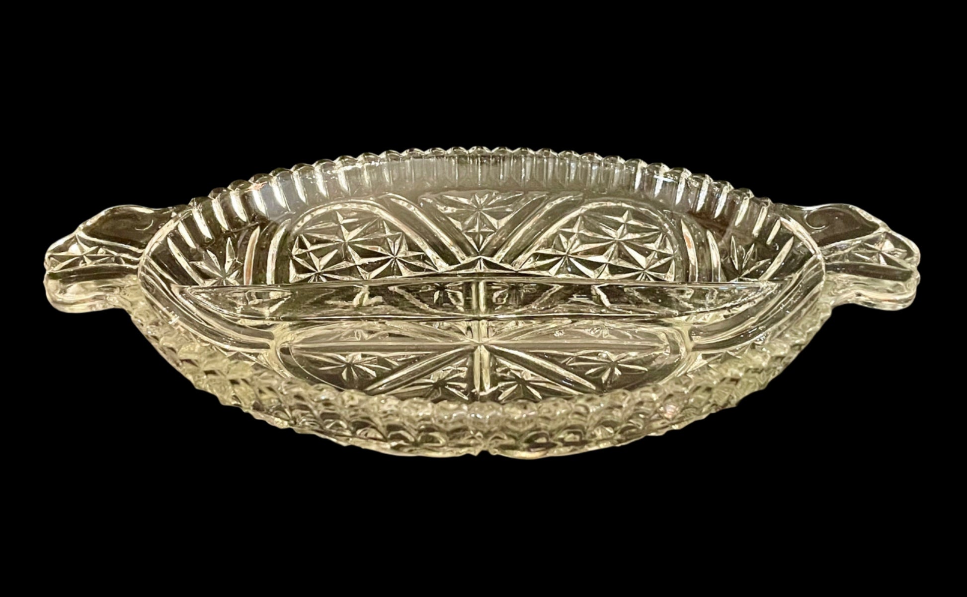 Stars and bars thousand line divided glass dish. Used but in great condition. Perfect for relish, nuts, candy or other snacks and condiments.