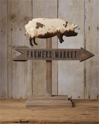 Tabletop Sign With Pig on Top, and Farmers Market Inscription