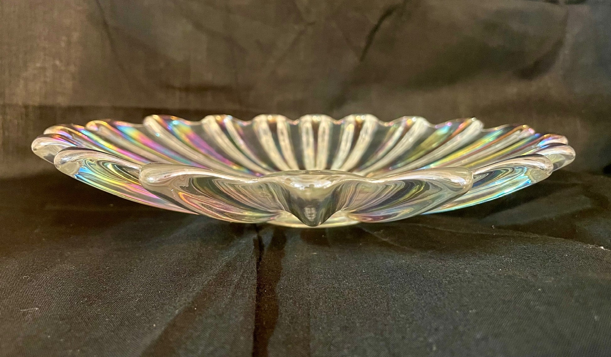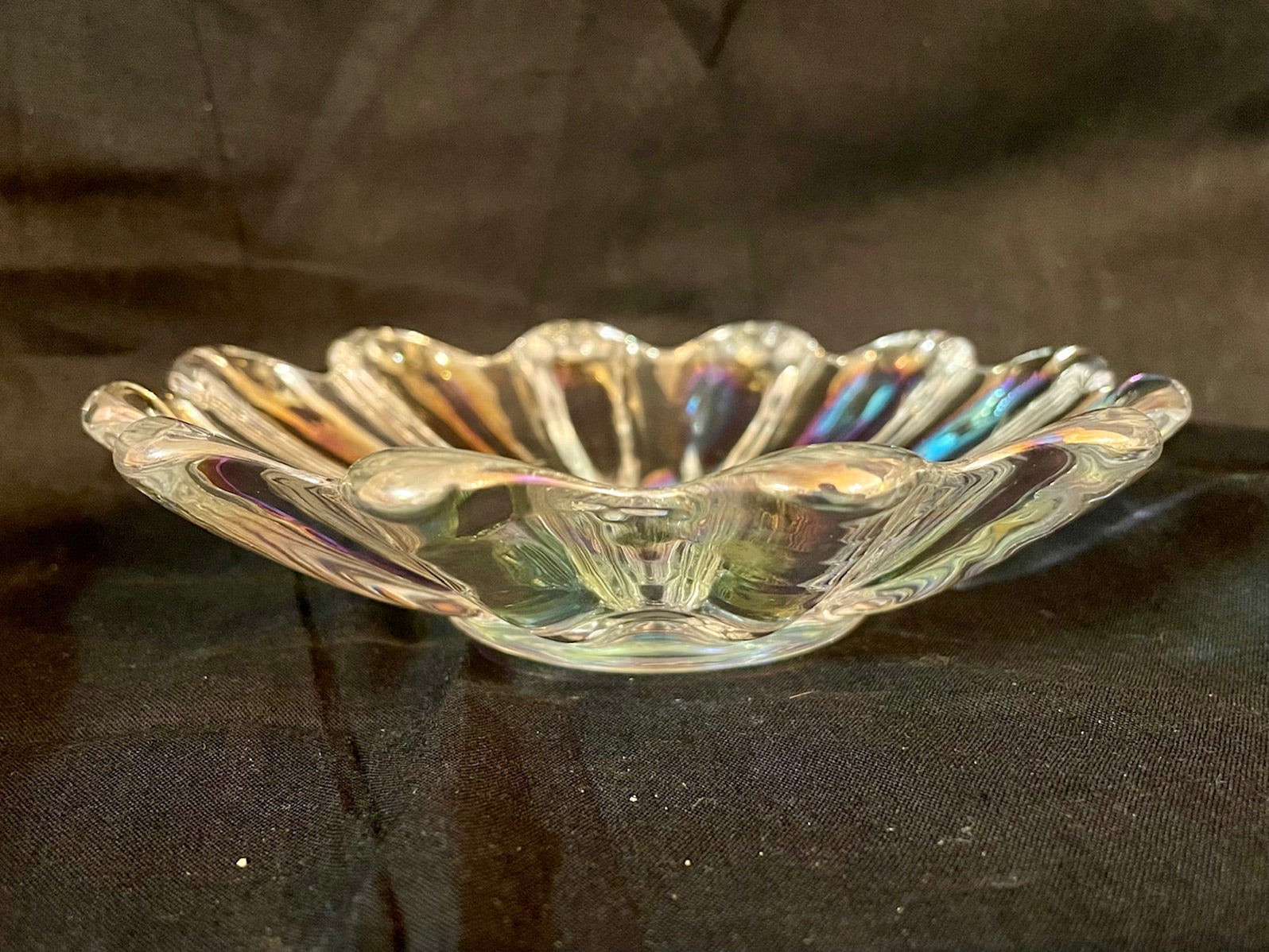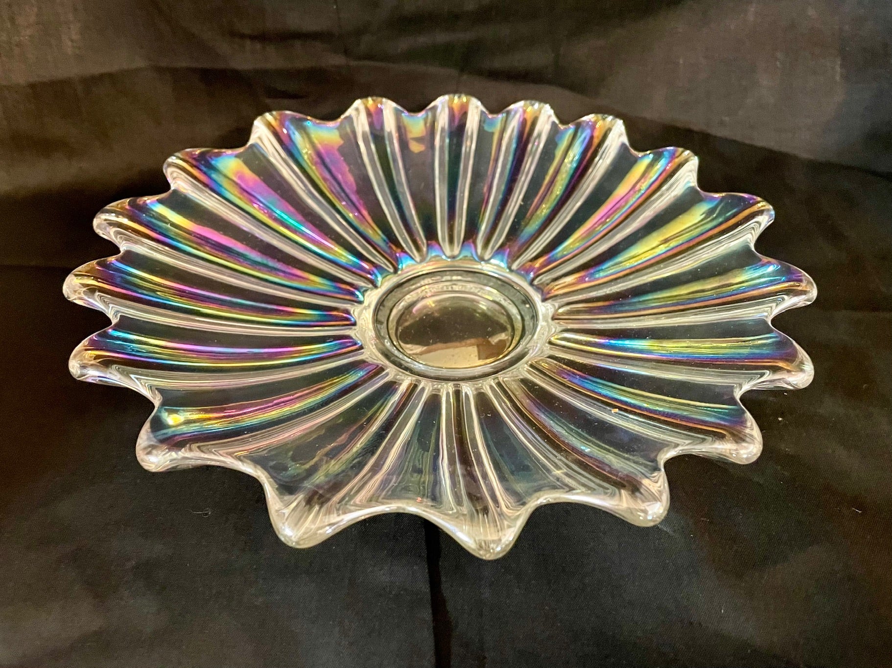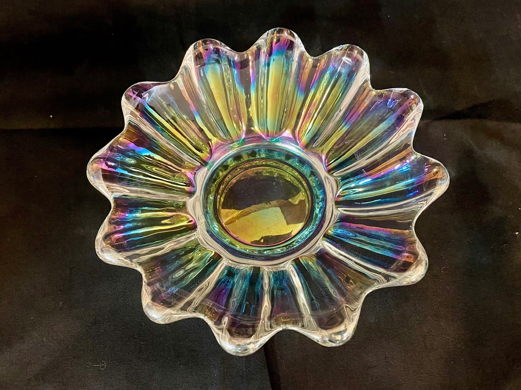 Vintage carnival glass bowl that is iridescent in color, and shaped in a starburst or sunflower pattern. Two sizes available.