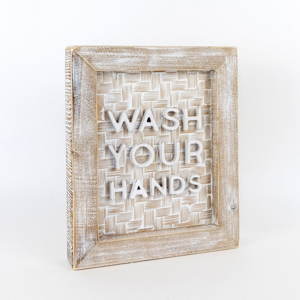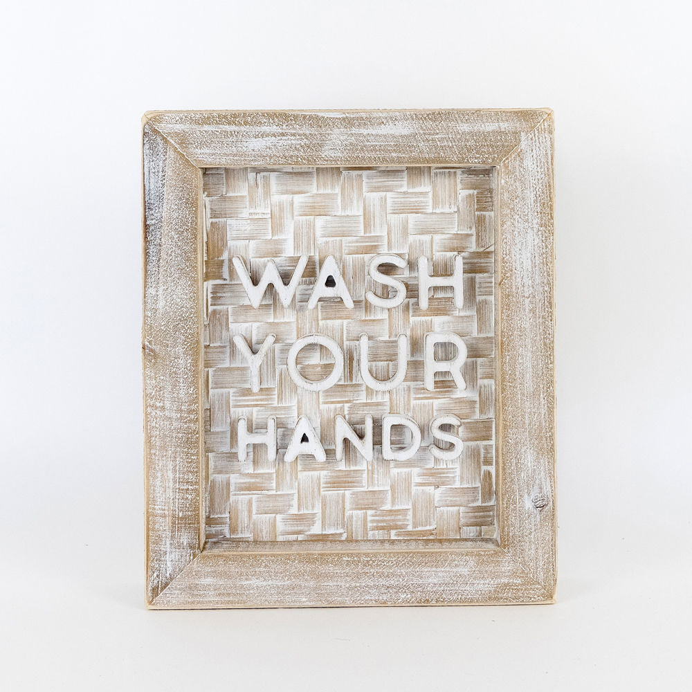 Bamboo wood framed sign with "Wash Your Hands" inscription. White, brown and natural colors.