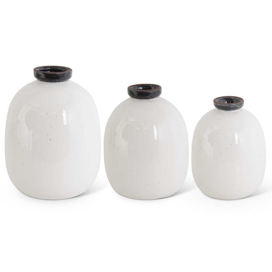 White Crackled Ceramic Vase with Black Speckles and Rim. Choice of 3 sizes; sold individually.