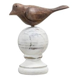 Wood Carved Bird Finial is a wooden knob with a white, distressed finish that is topped with a carved, wooden bird finial design.