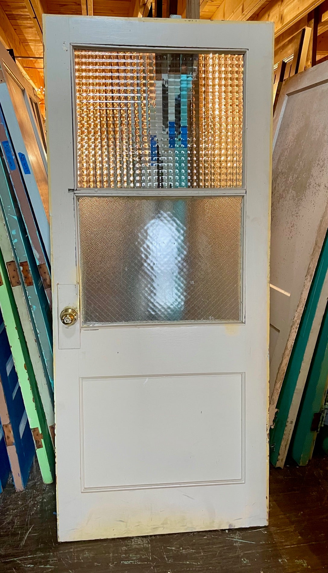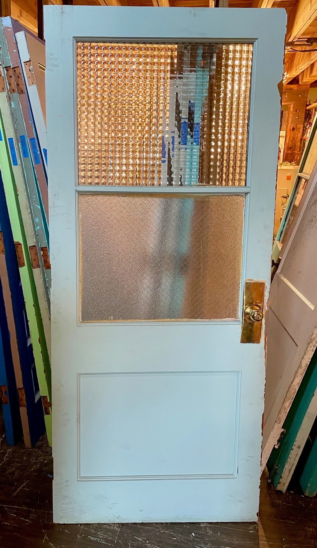Wood Door with textured glass panels on the top half. This door is solid and heavy duty.