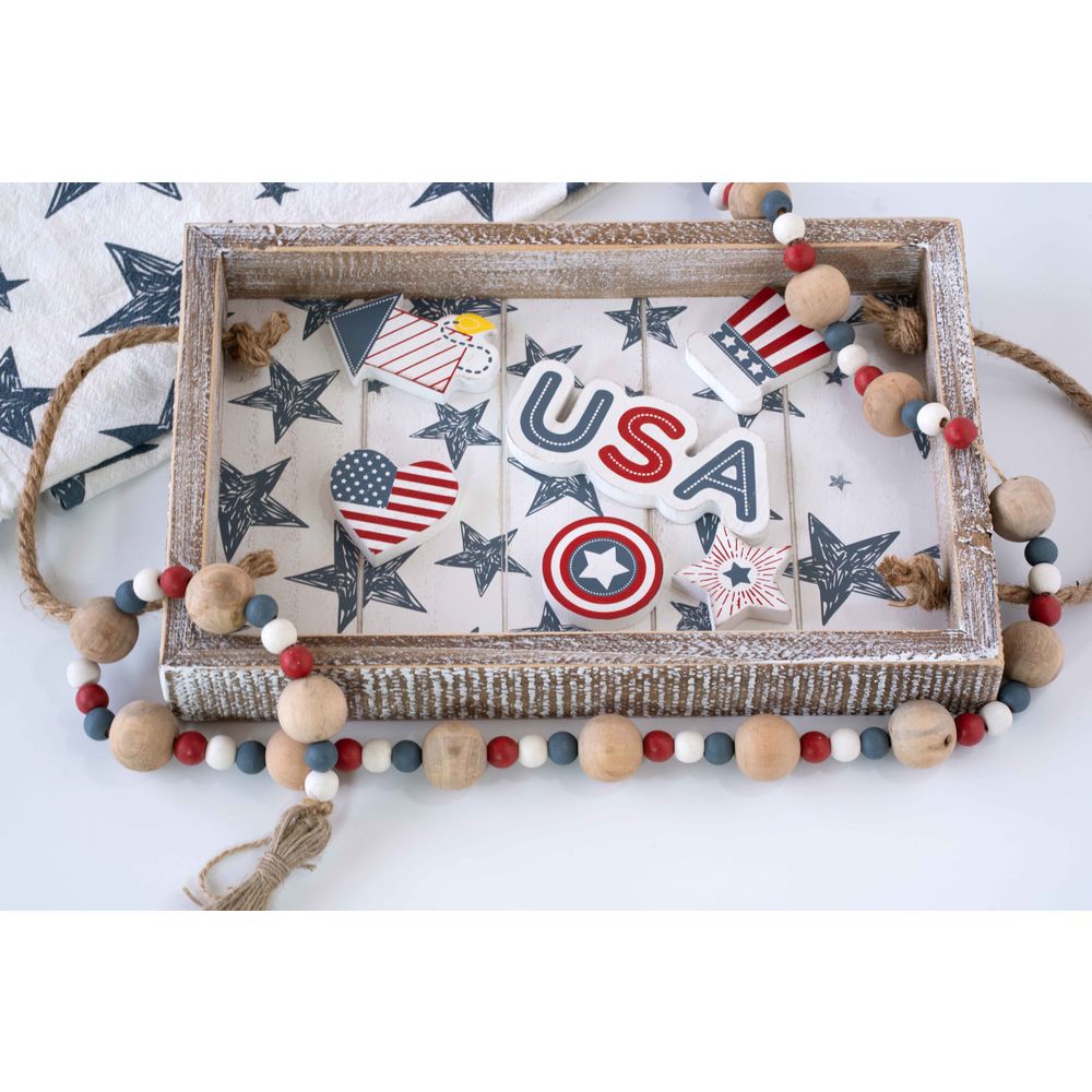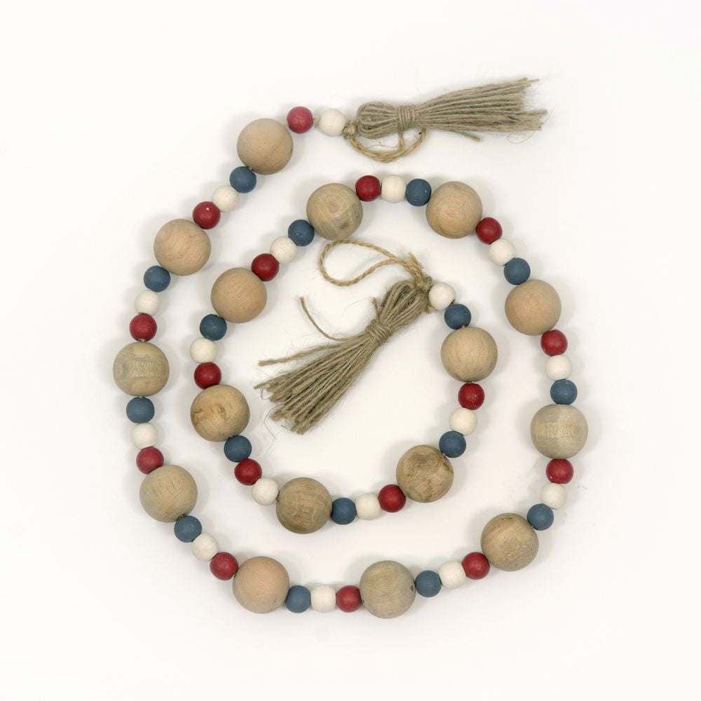 Demonstrate your patriotism or loyalty by having this wood bead garland with tassels that is very simple and visually appealing. It has brilliant colors of red, white, neutral, and black to match seasonal accessories.